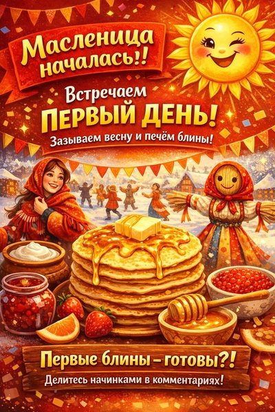 Сегодня — первый шаг к весеннему настроению! Пора надевать улыбку, приглашать друзей и встретить Масленицу с радостью и теплом в сердце!