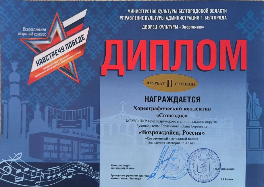 Наш хореографический коллектив «Созвездие» с номером «Возрождайся, Россия» стал Лауреатом II степени на Всероссийском открытом конкурсе «Навстречу Победе»