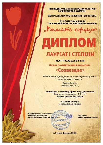Поздравляем хореографический коллектив «Созвездие» и его руководителя Юлию Герасимову с заслуженной наградой!